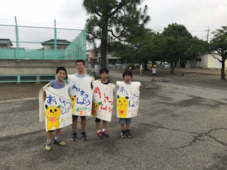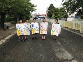 児童会が毎週月曜日と木曜日に、学校の正門(南門)と北門に別れて、朝の『あいさつ運動』を始めています。児童会の役員の皆さんは、登校班で学校に着いたらすぐに正門、北門に集合し、写真のようなあいさつ運動の看板を身に付けて、登校してくる友だちに大きな声で、「おはようございます。」とあいさつをしています。児童会の人たちより先に、元気な声であいさつをしてくるお友だちもたくさんいます。地域で交通安全を守るボランティアの方からも,挨拶が良くなっていることを聞くこともありますが、もっともっと元気よく自分から言えるように、このあいさつ運動を通して実現できたらいいと思います。
