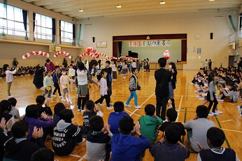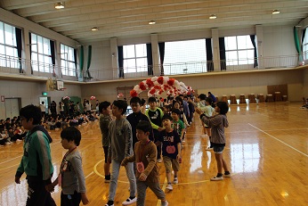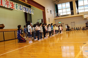 ※6年生と手をつなぎ入場した1年生は、緊張しているような顔でしたが、体育館のあたたかい雰囲気にすぐに笑顔になりました。特に、歓迎の言葉は、児童会の9名が中心となって、2年生から6年生の全員でしっかりとできました。そして、1年生の呼びかけも元気よく発表できました。