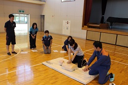 ◇本日の校内研修は、応急手当講習会でした。深谷市消防本部より4名の署員の皆様に実地指導をしていただきました。万が一の事態に備えて、プールが始まる前のこの時期に研修をしてます。