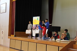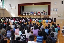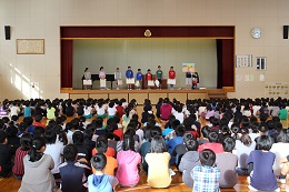 ◇本日の朝会は、児童集会です。今日は、図書委員会からのお知らせと出し物(紙芝居)です。始めに、図書委員会から図書室のきまりについて、演劇風にまとめて分かりやすく発表しました。後半は、「まほうの指輪」という物語を、手書きの紙芝居にして発表しました。紙芝居の絵は大変上手に描かれており、市販されているもののようでした。読み方も上手に読んでいて、全員児童が聞き入っていました。