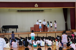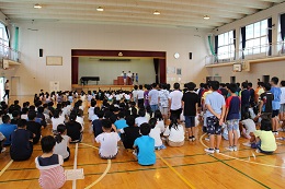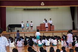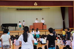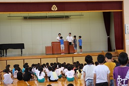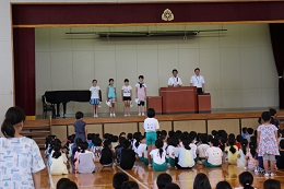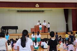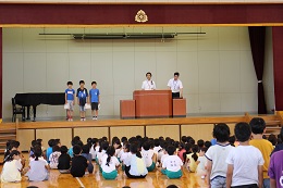 ◇朝から蒸し暑く、今朝の表彰朝会は、体育館で行いましたが、窓やドアを全て開放していても、体育館の中は蒸し暑かったです。しかし、児童はたちは体育館に入ってからも静かに始まるまで待つことができ、朝会が始まってからもしっかりした態度で聞くことが出来ました。