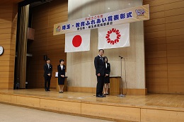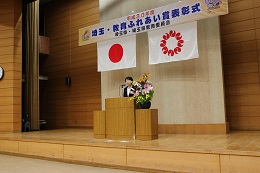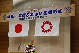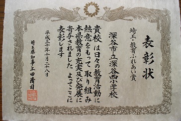 ◇10月28日(日)、埼玉県庁講堂において、平成30年度「埼玉・教育ふれあい賞」の表彰式が行われました。本校は『確かな学力、規律ある態度の育成や体力の向上』の部門で受賞をすることができました。この「埼玉・教育ふれあい賞」は、埼玉県が「彩の国教育週間(11月1日から7日まで)」に合わせて、日々の教育活動に積極的に取り組んでいる県内の学校・団体を表彰するものです。今年度は41団体が受賞になりました。この部門では、小学校2校と教育関連団体1団体が受賞でした。受賞の理由につきましては、本ホームページ、学校だより11月号をご覧下さい。このような素晴らしい表彰を受賞することができましたこと、本校全職員の研修の取り組みの成果ではありますが、保護者・地域の皆様の日頃からのご理解ご協力があっての受賞と考えます。今後も深谷西小学校への変わらぬご支援ご協力をよろしくお願いいたします。