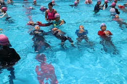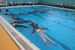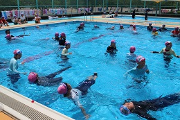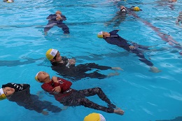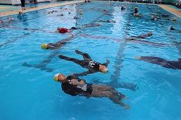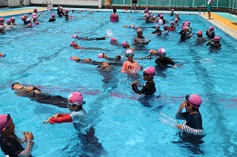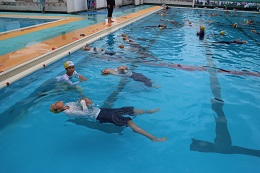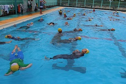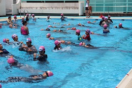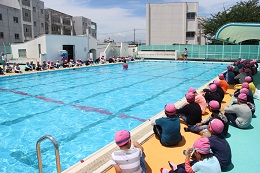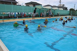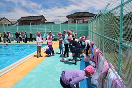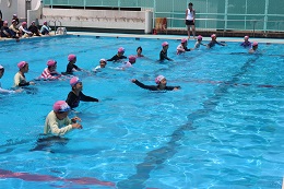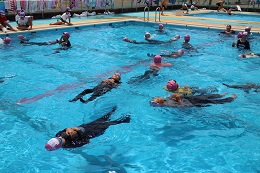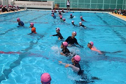 ◇いよいよ1学期も残り今日を含めて5日となりました。暑いときにはプールがとても気持ちよく夏には最適な学習だと思います。5年生と6年生は、今日で1学期の水泳学習(プール)が最終となります。そこで、夏休み中など水による事故を防ぐために、着衣水泳を実施しました。はじめは、通常の水泳の学習を行い、その後、着衣のままプールに入水し、歩く体験をしました。そして、着衣のまま水に浮き続ける泳ぎを習い、実際にやってみました。最後は、身近なもの(ペットボトルやランドセル、ビニルの袋)の中から、今日はペットボトルをラッコのように抱えて、水に浮く練習をしました。はじめはなかなかバランスがとれないでいましたが、すぐに慣れて浮けるようになりました。夏休み中に、海や川でこのような緊急の状況になることは避けたいことですが、万が一溺れそうになった時は、今日の体験が充分に役立つと思います。