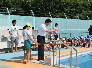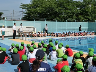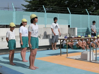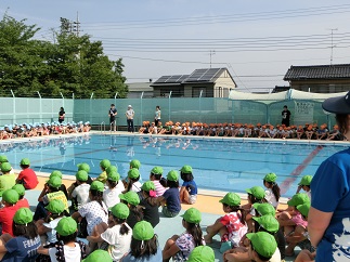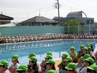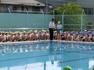 ◇今日は、朝から良い天気です。6月5日(火)には、4年、5年、6年生がプール清掃で、ドロドロだったプールの底に溜まっていた泥水をきれいにしてくれました。おかげでプールがとてもきれいになり、今日のプール開きができました。児童全員がプールサイドに座り、おしゃべり一つしないで立派な姿勢で聞くとこが出来ました。大プールと小プールの4隅にお清めのお酒とお塩をまきました。また、校長先生からの挨拶では、「プールはとても楽しく体も鍛えられますが、ひとつ間違うと大きな事故につながります。ですから、先生の指示に従って、ルールを守って事故や怪我が絶対にないようにしましょう。」とお話がありました。来週の6月11日(月)からは、いよいよプール活動が始まりますので、体調を整えてプール道具やプールカードなどの忘れがないようにしましょう。