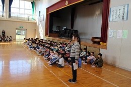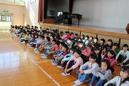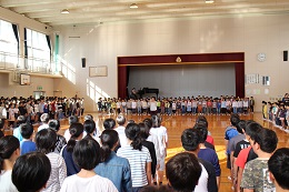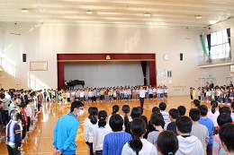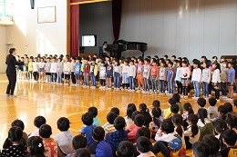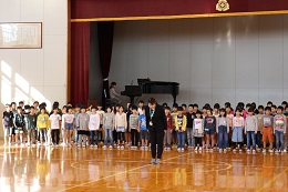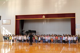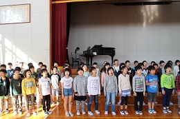 ◇今月の歌は、「もみじ」です。今朝は音楽朝会で、始めに今月の歌「もみじ」の合唱を全校で歌い、後半は、3年生の歌「恐竜とチャチャチャ」です。全体合唱は、秋空のとても気持ちのいい今朝にぴったりの歌声で、気持ちが良くなりました。3年生の歌は、学年全員が一人の歌声に聞こえるような、みんなの気持ちが一つになった美しい歌でした。また、歌の中に手拍子が入るところも、全員の手拍子がピッタリ合っていて、歌声と一緒にみんなの気持ちが一つになっていました。次の音楽朝会も楽しみです。