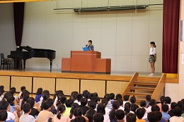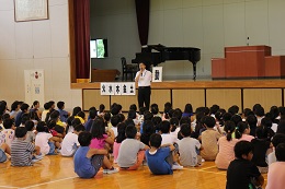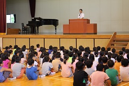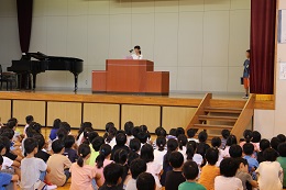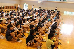 ◇終業式では、校長先生からの二つの内容のお話がありました。その後、5年生、3年生の代表児童が、1学期を振り返っての感想とこれからのめあてを読み上げました。また、生徒指導主任や安全主任の先生から、夏休みに向けての諸注意がありました。