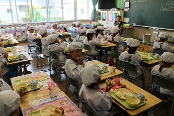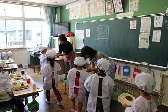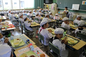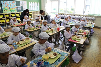 6年生のお兄さん、お姉さんたちが準備を手伝ってくれて、給食の時間に「いただきます。」ができました。今日のメニューは、ハンバーグでした。初めてなのに、とっても上手に食べていました。たくさん食べて丈夫な体をつくりましょう。
