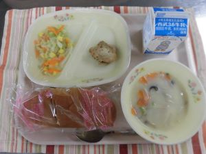 牛乳 黒パン 鶏肉のはちみつマスタード焼き