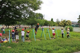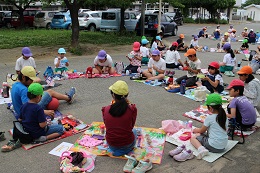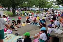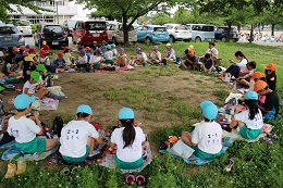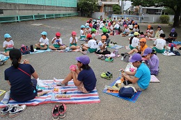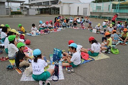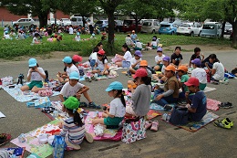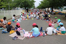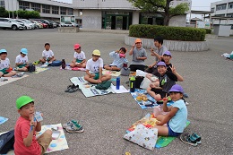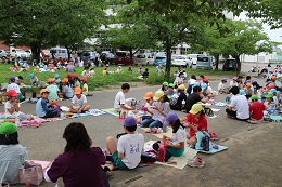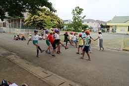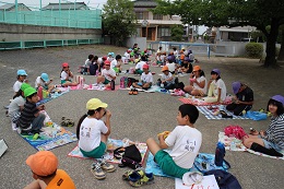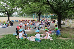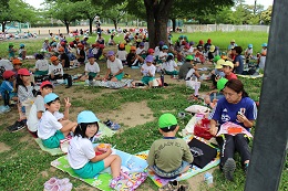 ◇今年一回目のふれあい給食です。月曜日に班員の自己紹介があり、縦割り班活動がスタートしました。今日は、『ふれあい給食』を縦割り班で一緒に食べました。朝から天気が気になっていましたが、曇り空ではありましたが、どうにか全員が外で食べることができました。その後は、縦割り班で計画したレクリエーションで楽しく遊びました。